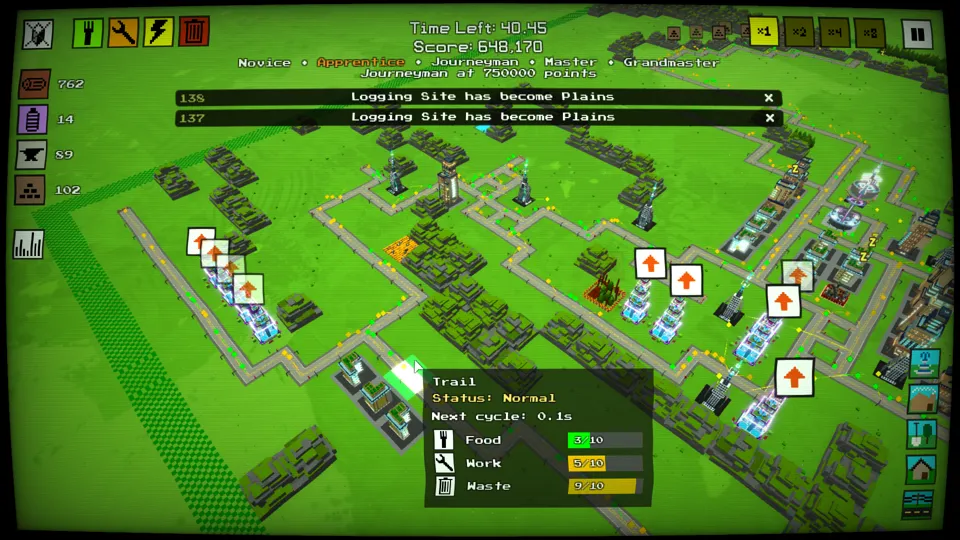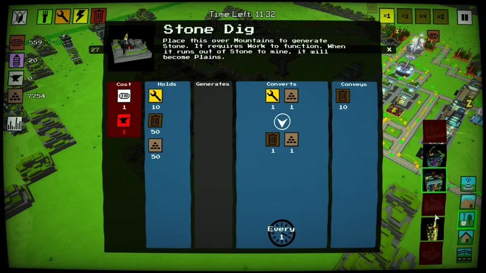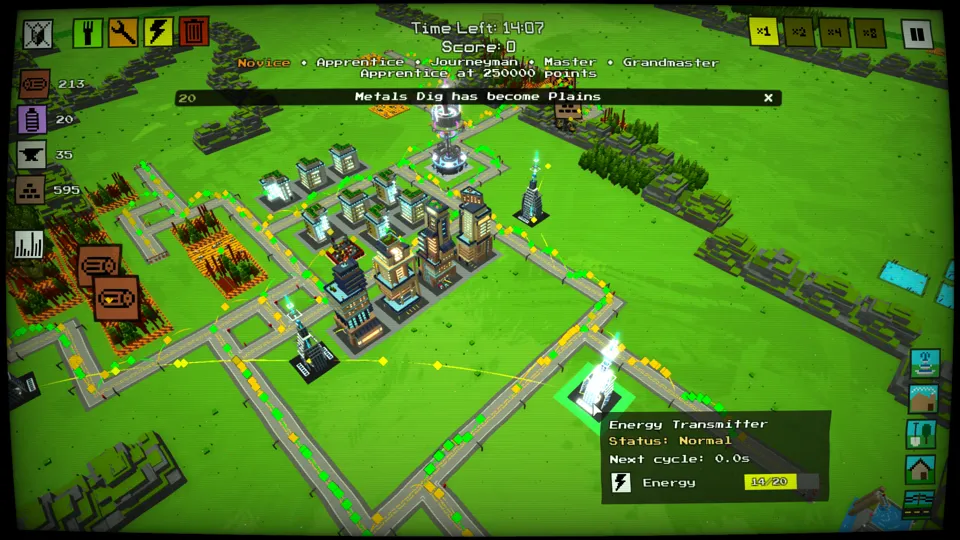 20 Minute Metropolis is technically a city builder, though it is a distant cousin from something like Cities: Skylines. Much like other city builders, the goal is to build the ideal city and watch an untamed field grow and expand into a glorious testament to humanity’s ingenuity. However, in adding a time limit, the game ceases to be able to focus on a careful building and perfecting of layouts or balance. It instead becomes a frantic scramble to keep up with rapidly diminishing finite resources and the unceasing demands of a changing landscape. From start to finish, the city in 20 Minute Metropolis never feels controlled. It always feels as though it’s teetering on the edge, even though the edge is meaningless. There is no failstate in 20 Minute Metropolis. You cannot go bankrupt or see your citizens starve. Indeed, you effectively have no citizens. There are only the goals you set for yourself and the ever-present clock to provide a sense of competition. Yet somehow, that’s enough to keep the adrenaline flowing.