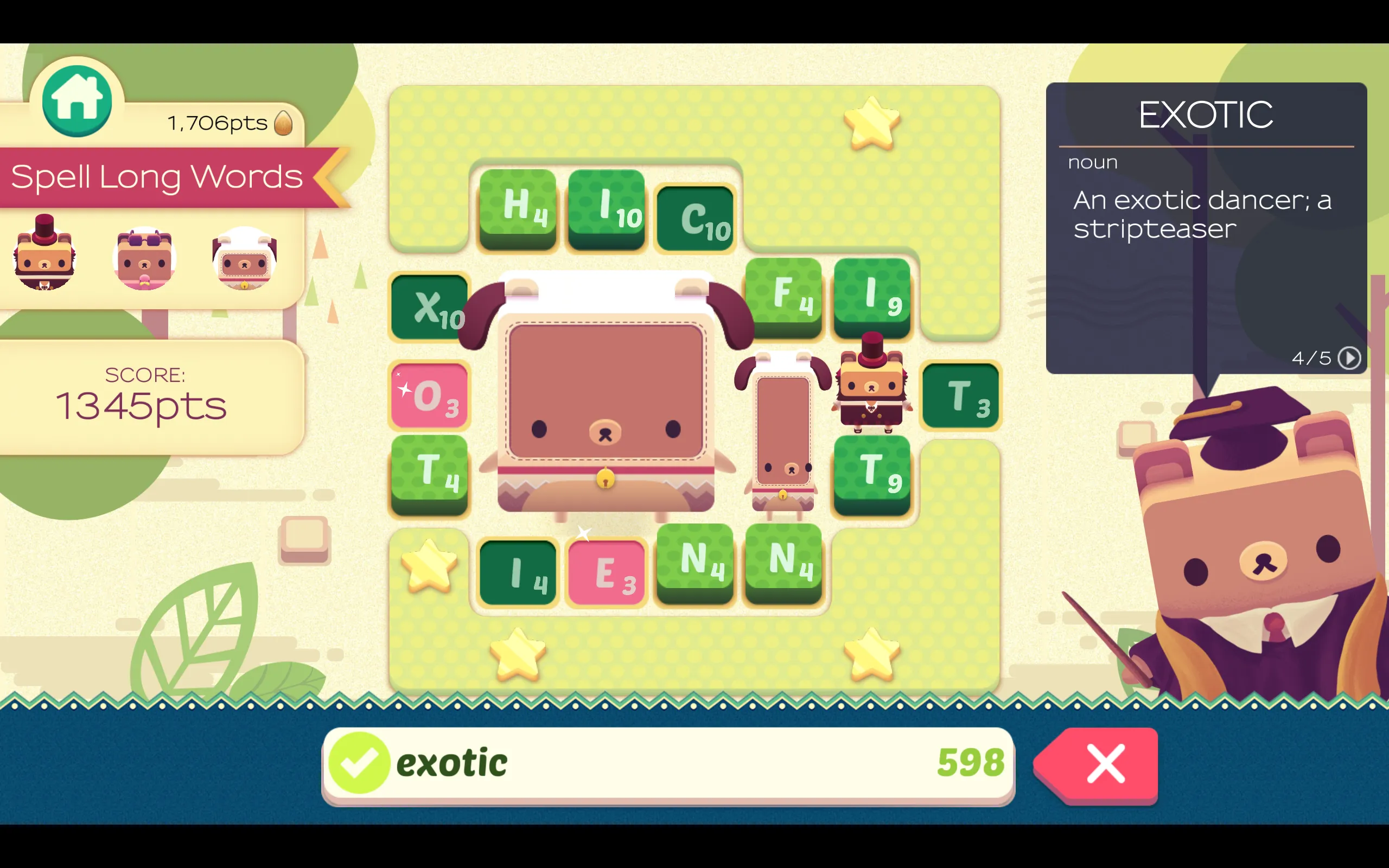 There is a lot about these mechanics that works. The idea of finding words in a jumble of letters is a tried and true formula, but is also one that has been played out in a large variety of forms already. Making each letter single use and adding a timer adds a more strategic dimension to the puzzle that is a welcome change of pace. Rather than having a grand old time making monstrously long words, I thought more strategically about what I wanted to make, and why I did have to use that x with one turn left on it, actually. The inclusion of these mechanics forces the player to stretch beyond the familiar words they’re used to in these types of games, and instead, reach for more esoteric and exotic ways to make their bears grow and grow.