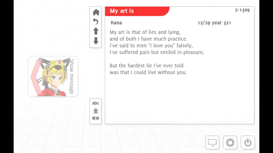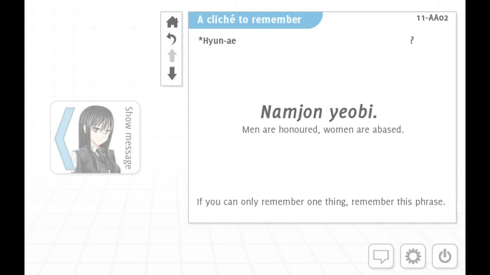 The meat of the game, then, is in its story. As the investigator reads, they learn that something happened that caused the people of the Mugunghwa to emulate 15th century Korean society. Women are not only removed from power, but removed from history itself, stripped of their names and identities and instead just part of whichever man’s family they are part of at that moment. The two AIs of the game - *Hyun-ae and **** *Mute - comment with their unique perspectives on this as the player navigates through an endless maze of letters, gossip, and poetry to figure out what happened.