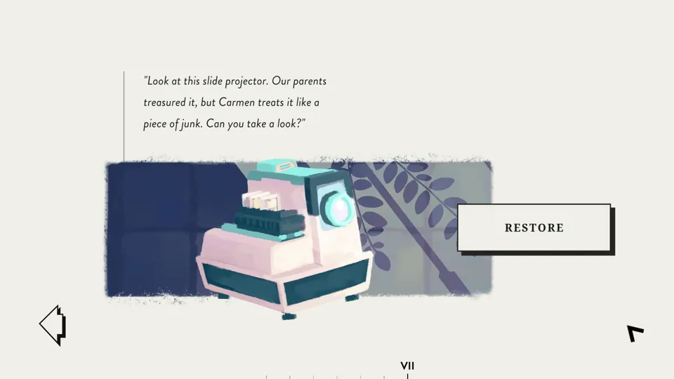 Except, even with that guide, the repair process becomes frustrating. The controls are twitchy at best. More times than I care to count, I put a piece down or picked something up when what I wanted was to turn or select something. Multiple times, my idea of how best to fix something didn’t align with what the game wanted, and so I would stare at it, trying to think of the item and its repair, not as how I would do it, but from the perspective of the devs, and how they envisioned the repair process for this item. This became especially frustrating with items I knew nothing about, like the slide projector. Here, the twitchy controls meant I had no idea if I lined mirrors up correctly, or if there was some other problem that I didn’t have the context to understand. The game is so centered on guiding the player that, when the guide leaves the player, there is no real way to get back on track. Repairs become not a cozy act of fixing something broken, but of struggling with controls and puzzling through the creators’ intentions.