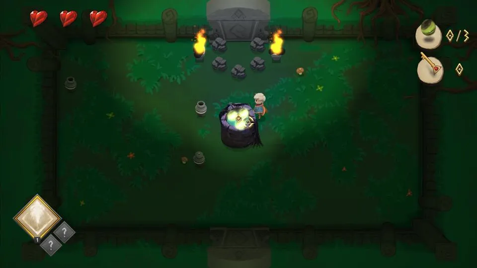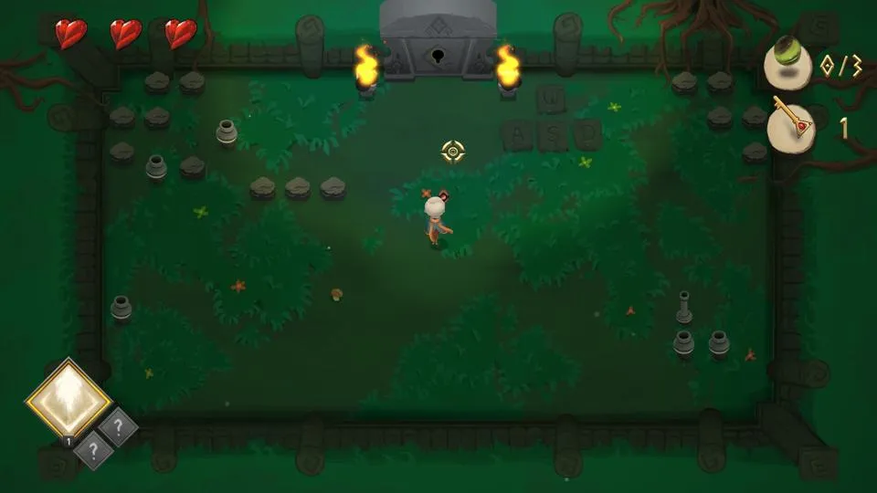 To make her way through the dungeon, Opal has a variety of weapons. Combat is a fairly standard pointing and shooting, combined with a happy little dodge roll that I, more often than not, used to careen myself off a cliff. The mechanics are not unique, nor do they have any need to be.
