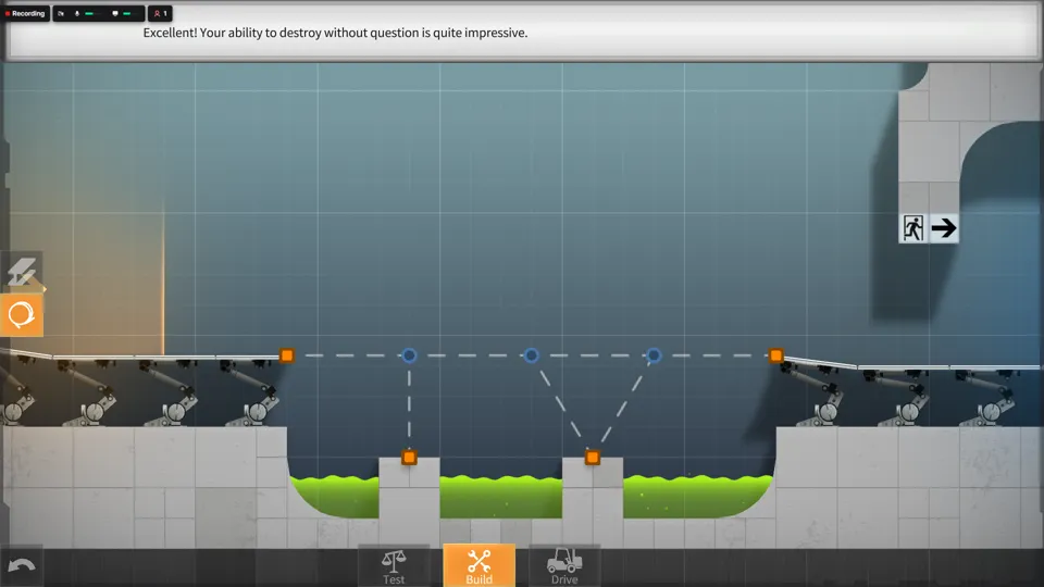 As a Portal game, it feels as though it’s a window on the world without actually being in the world. That distance, while a clear side-effect of being a different genre, also means Bridge Constructor Portal feels like it’s told more from the perspective of GLADoS than a test subject. It is a bridge game before it is a Portal game.