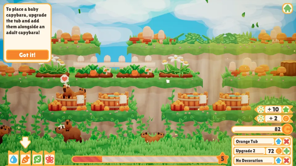 There is literally no fail state in this game. There is no way to stall out, no way to run out of cash, no way to fail to summon at least one muddy and bedraggled capybara in need of a thorough pampering. All I as the player have to do is click a capybara, put them in a tub, give them what they want, then remove them from the tub. The game moves as quickly or as slowly as I want it to, with the speed being dependent on the number of tubs and how fast I feel like clicking. The capybaras never get upset and leave. They never bite each other. They bask placidly. politely requesting carrots, blueberries, or a fun little hat.