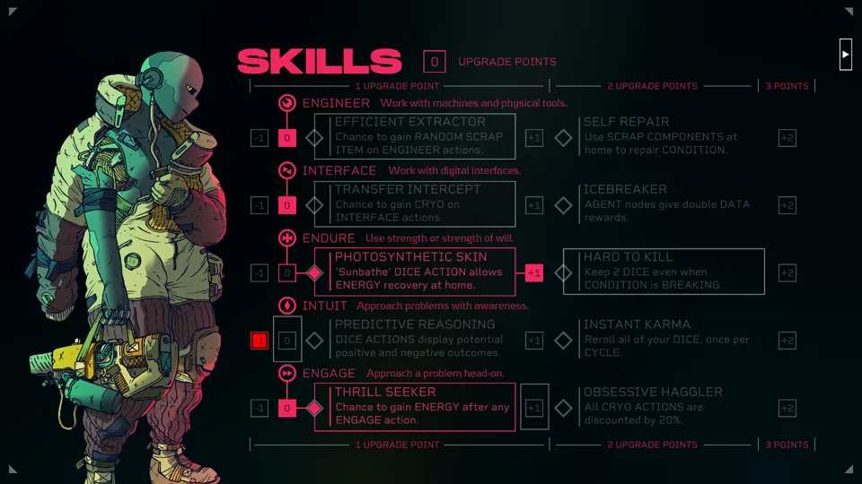 Citizen Sleeper is difficult to place in any particular genre. It has some survival elements, though these are light and fade away by the mid game. It veers close to a visual novel, though it has more interactivity and player agency than I would ascribe to a visual novel. Even though it has some degree of character customisation, it’s not quite an RPG either. It is, much like its main character, a blending of a variety elements into something wholly new and intriguing. The game’s mechanics are similarly unique. The player has a set of dice that they can invest in actions, though how they choose to invest these, and the risks they choose to accept in doing so are wholly up to them. Indeed, the dice themselves are not the point. They are a vehicle to get to the story, and to see how the world around the Sleeper plays out.