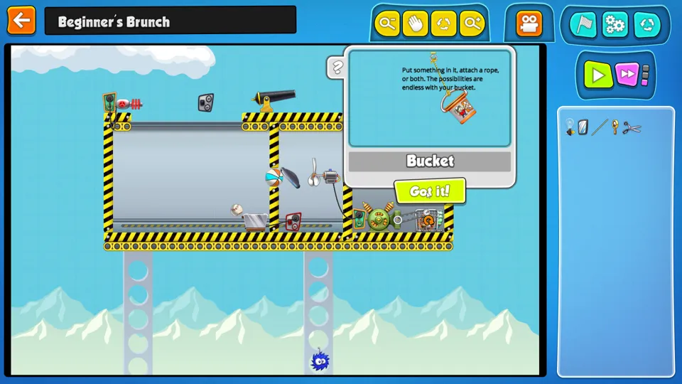 Contraption Maker is a building puzzle game. Players are presented with a goal - such as “Get character A to point B” - and are given a few pieces and the whole of physics with which to solve the puzzle. These pieces do a variety of things, from shooting lasers to starting fires to just providing a platform on which to walk. When supplemented with the pieces already pre-placed in the puzzle, however, these simple pieces still offer a range of possibilities for solving whatever puzzle the player faces.