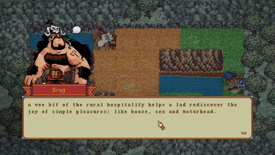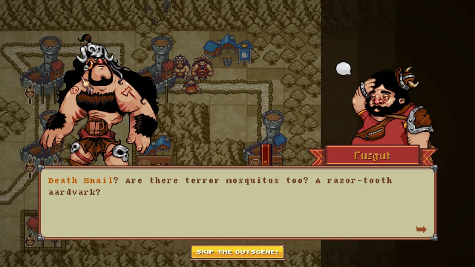 The true strength of Crush Your Enemies, though, lies not in its RTS mechanics, but rather, how those mechanics play into its narrative and its sense of humour. Crush Your Enemies has a very specific humour, one based on raunchy, dumb, but ultimately weirdly wholesome jokes. Watching lewd barbarians traipse through a fantasy kingdom, ranting about beer and “banging” is hilarious, and the game does an excellent job landing its very silly and very dumb jokes. The idea of pairing the normally serious RTS genre with a juvenile sense of humour is a stroke of genius that just adds a new level of fun to its slapdash battles.