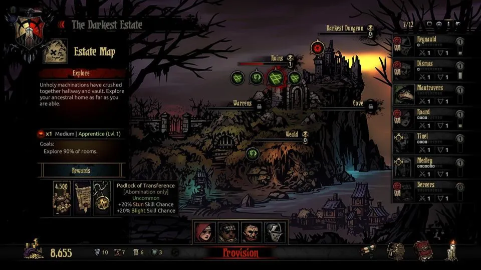 The actual dungeon crawls represent the bulk of gameplay. Players traverse procedurally generated dungeons, fighting monsters, disarming traps, and collecting loot. They have limited inventory space, and so must make choices between things like having light and food, or scampering out of the dungeon, laden with fun treasures. In many ways, Darkest Dungeon is also an inventory management game, with players needing to make decisions about how much they’re willing to sacrifice, and what risks they’re willing to take with the limited space available to them.