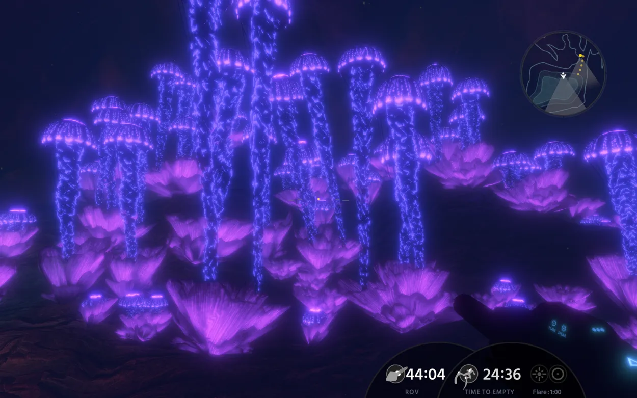 The game’s mechanics and atmosphere suggest to the player that they should think strategically about how and when to approach the guarded groves. If each shot costs energy, and taking damage costs energy, then the energy gained from the grove should outweigh what’s spent to harvest it. Indeed, the game’s plot also suggests that the player should be thinking critically about how to engage with the groves, as everything suggests the more that’s harvested, the worse the consequences for their health and chance of survival. This is not, however, how the game actually plays. Instead of thinking strategically and skipping groves or sniping at guards from a distance, the ROV companion makes the decisions for the player, barrelling into the middle of a group of guards, then complaining when the player doesn’t immediately rescue it from its predicament. More times than I care to count, I successfully slipped past a guarded grove because I was nearly full on energy, only to get hit notifications because the ROV decided to harvest energy we did not need. Other times, after clearing a grove, the ROV would refuse to fully harvest, leaving me with less energy than when I started. All sense of strategy or agency went out the window, replaced by frustration and a sense that this companion was either willfully stupid, or actively sabotaging me, and knowing neither was actually canonically the case.