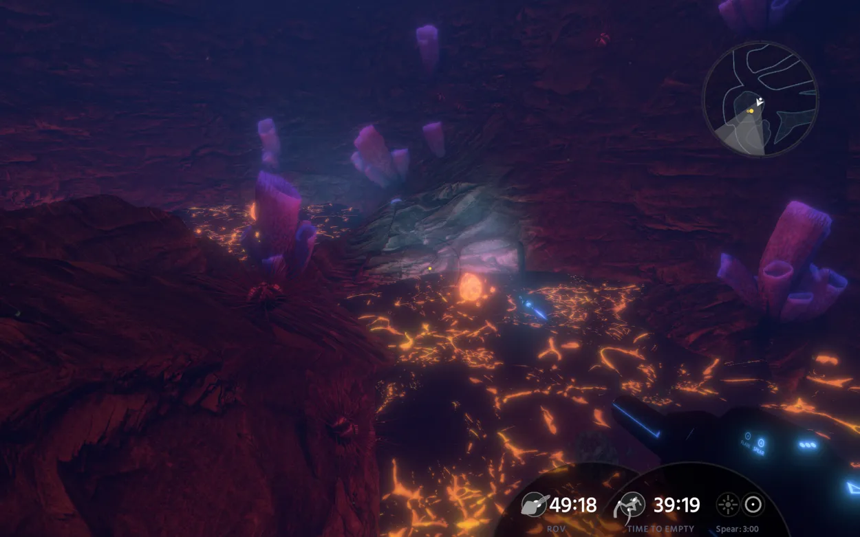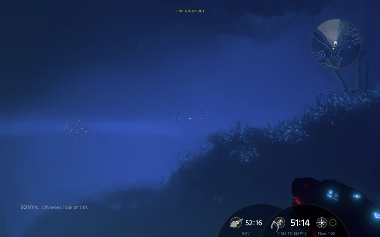Part of the game’s tension comes from the finite amount of energy the player’s suit has remaining. When that energy reaches zero, they freeze, drown, get crushed by pressure, or any combination of the above. Refilling that energy bar requires harvesting glowing orange balls with the help of Sonya, an ROV companion. Level design, then, generally consists of an energy grove - usually guarded - a gauntlet of some sort, and then another energy grove.
