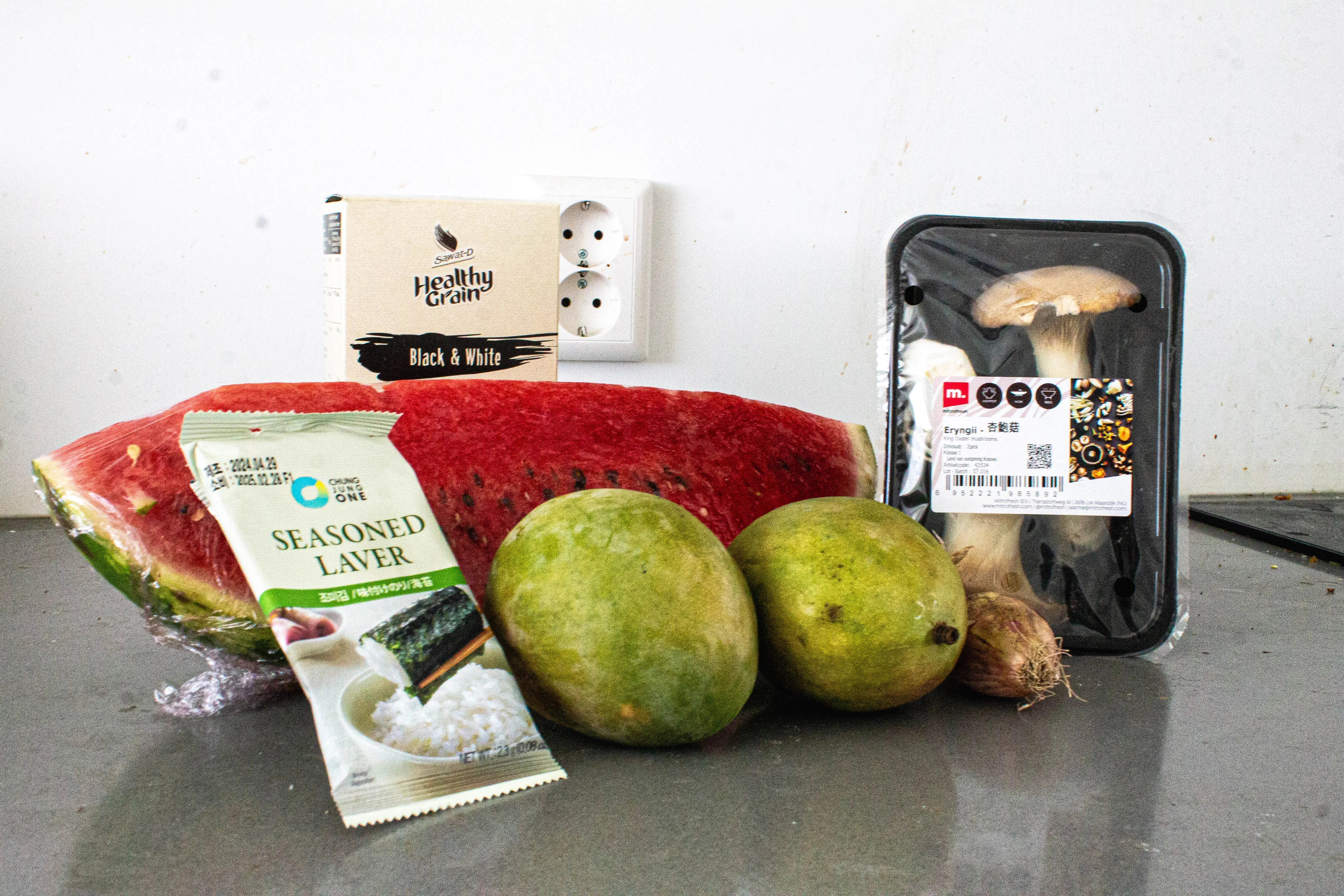 5. Lower the heat to medium, then add the watermelon, mango, and three sheets of crumbled seaweed to the pan. Cook until warmed, but not browning (3-4 minutes).