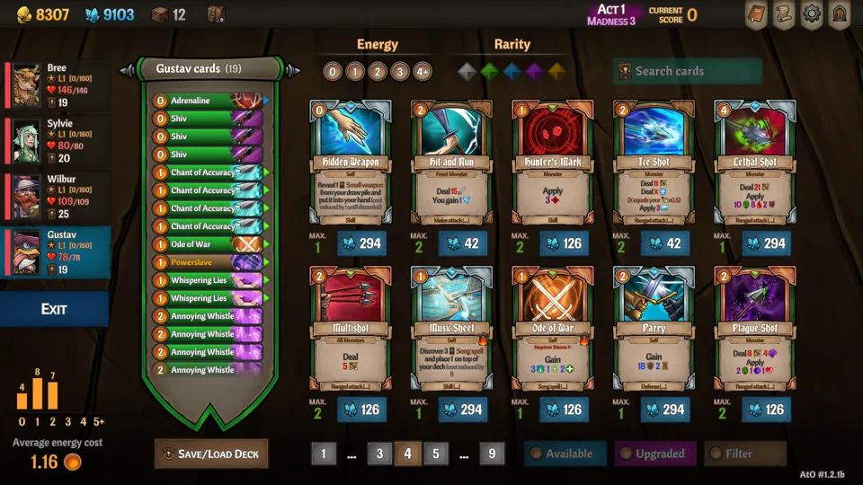 Each town contains a mechanic to remove cards (the church), a mechanic to upgrade cards (the shrine), a mechanic to create cards (the forge), and a mechanic to buy equipment (the shop). Players can gain currency for these buildings either over the course of their adventures, or through finishing the game and carrying over their loot from that run. While some equipment is limited to specific encounters, the majority of equipment and cards can be crafted or bought in the towns. From the outset, players can craft their decks into whatever they want it to be, and can potentially have the same deck every time. Indeed, the game itself has a feature where you can save and reload certain decks in order to use them again. The randomness that is the hallmark of the replayability of other deck-builders doesn’t exist in Across the Obelisk. Instead, Across the Obelisk is an optimiser with pre-inputted conditions. The challenge isn’t to make the best of what you’re given, but rather, to figure out how to beat the game before you’ve even played.