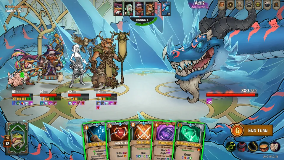 Though it is a deck-builder RPG, it is a very different style deck-builder RPG than Black Book specifically because of the balance it chooses to strike between story and mechanics. Black Book puts a heavy focus on its story, with mechanics being an almost secondary (but still critical) consideration. Across the Obelisk is a much more pure deck-builder, with the story being more flavour than the actual driving force of the game. Your goal as a player is not to uncover why Faeborg the dragon has frozen the elf forest, or to have a deep heartfelt conversation with Yogger about trauma and the Wolf Wars. Your role as a player is to get the party from the opening village to the ending cinematic using as many fun card combos as you can.