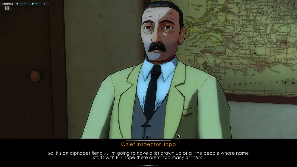 Agatha Christie: The ABC Murders (which I’ll be shortening to ABC Murders for my own sanity) is a mystery point-and-click game adapted from the Agatha Christie novel of the same name. The player plays as Detective Hercule Poirot, a French detective in London who is investigating a series of murders that seem to be committed by the same person. The player solves a series of puzzles, collects and connects clues, and eventually uncovers the true culprit.
