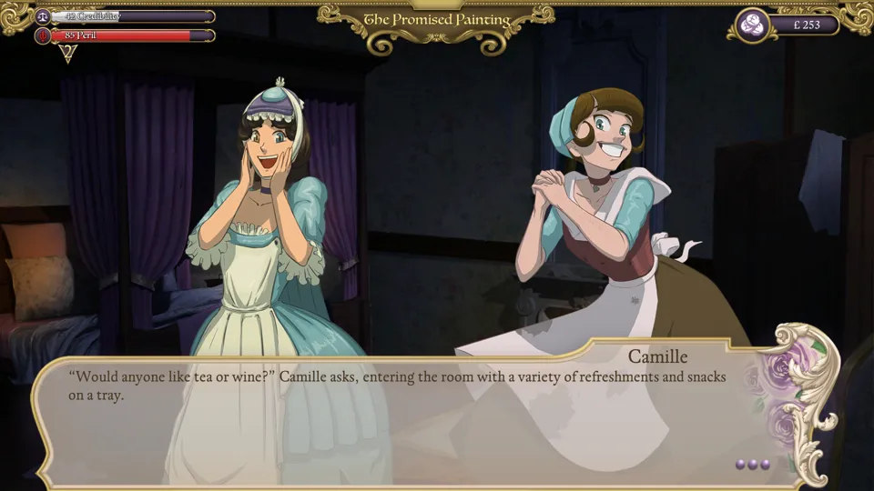 The parties and the mechanics around them lie at the heart of Ambition, and it’s here that the story truly excels. In addition to navigating a whirlwind of romance, Yvette navigates the world of Parisian parties, gathering rumours and establishing herself as a socialite to be respected. Each conversation requires that the player pay attention to what’s said, who they’re speaking to, and consider the consequences of their response. While some conversation outcomes are more transparent than others, there was never an outcome that seemed unreasonable or unpredictable. The story moves in reasonable, rational ways, bringing each of these characters closer and closer to the doom that awaits them.