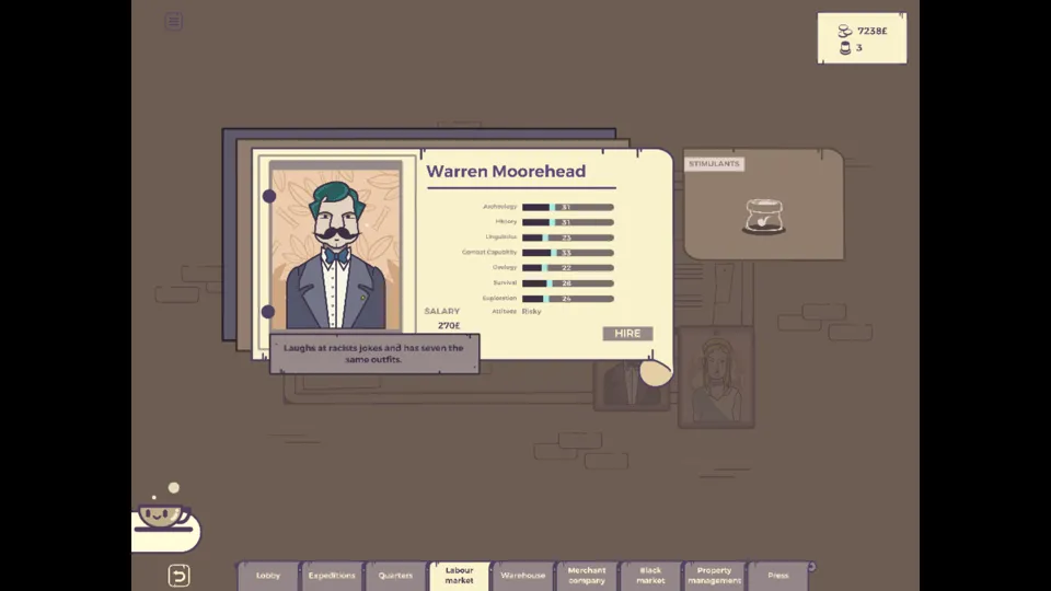 However much promise there is in the game’s concept, though, it’s the actual execution of these concepts that matters. The game can be effectively split into two aspects - the preparation and time between expeditions, and the expeditions themselves. The expeditions, for all the romp they are, are minimally interactive, with the main interaction being the party preparation beforehand, and choosing an explorer for a particular challenge when it arises. However, with each challenge being timed and no real information given about what the challenge is, beyond the needed skills, there is less the sense that you are submitting an explorer to a challenge, and more the sense that you are subjecting them to the mercy of a random number generator whose logic you are incapable of understanding. There is no transparency for the odds of success, neither during the expedition, nor during the preparation, leading to expeditions the player is woefully unprepared for, but which they had no real way of knowing they were unprepared for until it was too late.