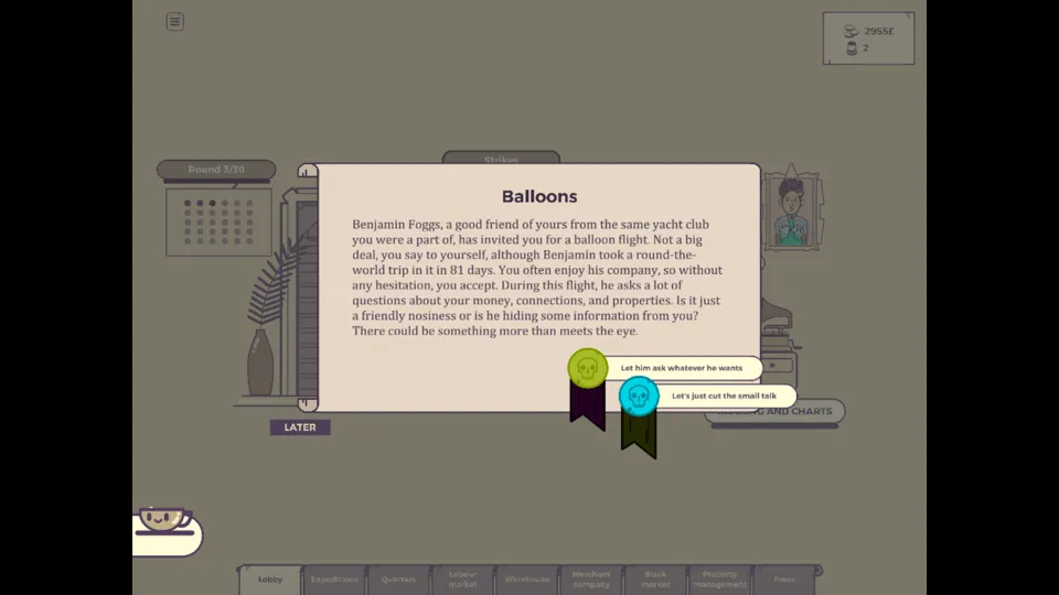 The management element of the game is similarly baffling. While there is a broad array of things to do, the reasons why I would do these things are not evident, nor are the actual victory conditions. Some, like the market, are straightforward, while others - like property and press - are confusing either in how to engage with them, or in why I would want to. It wasn’t until about a third of the way through the playthrough that I realised there was more I could do in the press room than just plying reporters with gin, but I am still unclear as to what the benefits actually are. Equally, while the property management seems like an interesting mechanic, beyond the basic elements of giving more money or resources, it’s unclear why I should engage with this element as heavily as the game seems to think I ought to be.