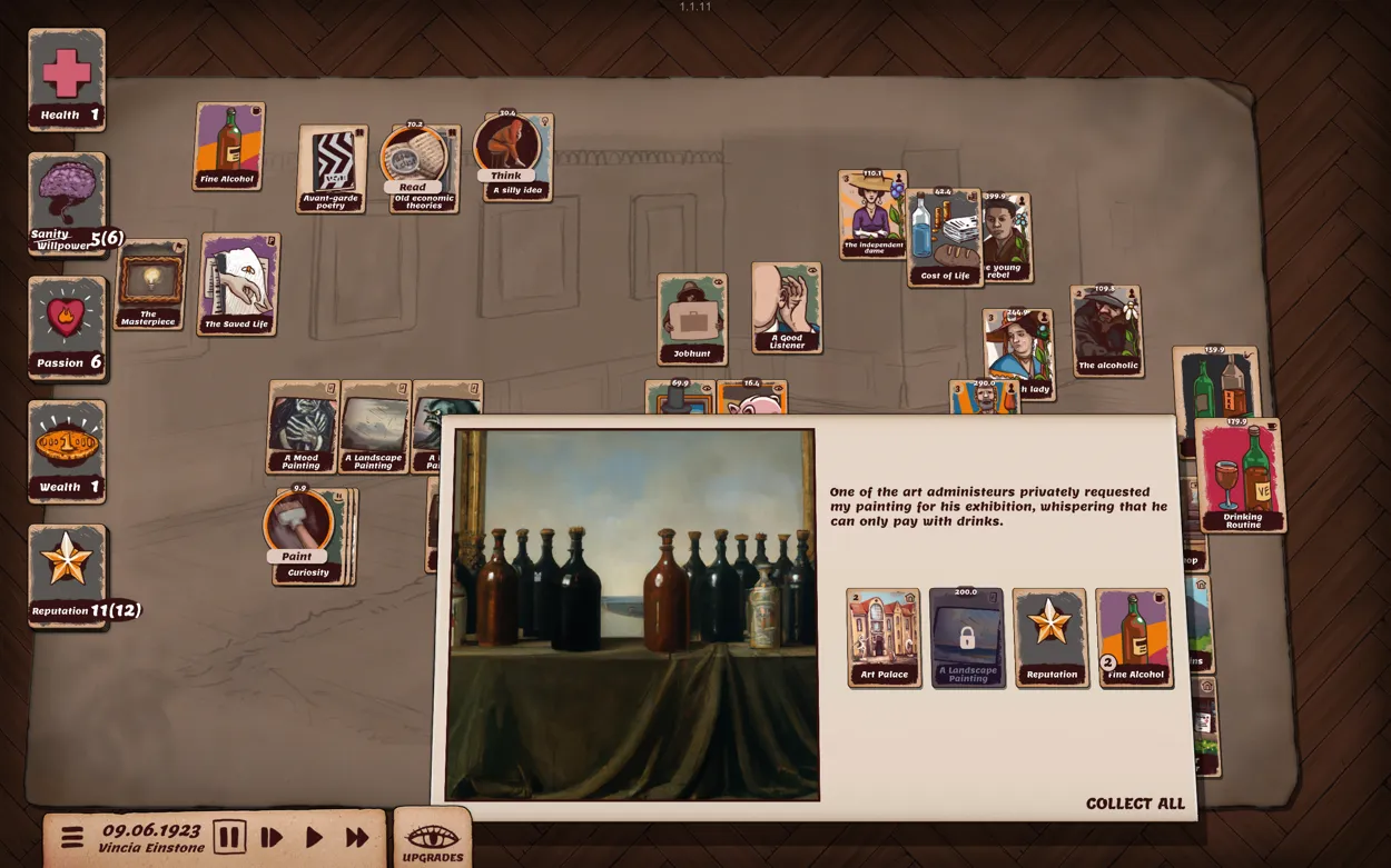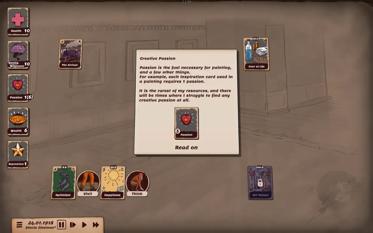 It’s obvious from my play time alone that I thoroughly enjoy this game. Gameplay and story-wise, it’s more akin to a digital board game than a traditional simulation game. Much of the strategy and gameplay centre around how to invest limited resources and limited actions to create a stable but growing loop. The game presents a fair few ways to invest these, whether they be in chatting with other people, staving off poverty, exploring the city, or - if you’re fortunate - painting. The subjects for paintings are drawn from the artist’s experiences, friends, and surroundings, with each providing some measure of value to the painting. Experiences that have had time and thought invested into them create better paintings, and vice versa.