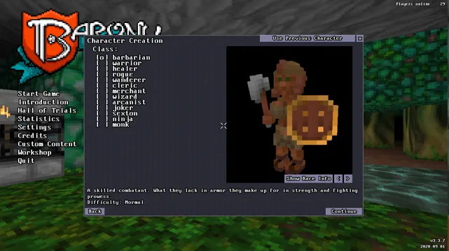In Barony, you play as a human (unless you have a DLC, which I do not) of one of several classes and races. The races, as far as I can tell, are aesthetic. The classes are not, and range in difficulty from beginner (healer, warrior) to extreme (jester). For the most part, these are your generic classes that you’ll find in most fantasy RPGs, though the addition of the joker is fantastic. The decision made here impacts the entire rest of the game, and indeed, the length of it.