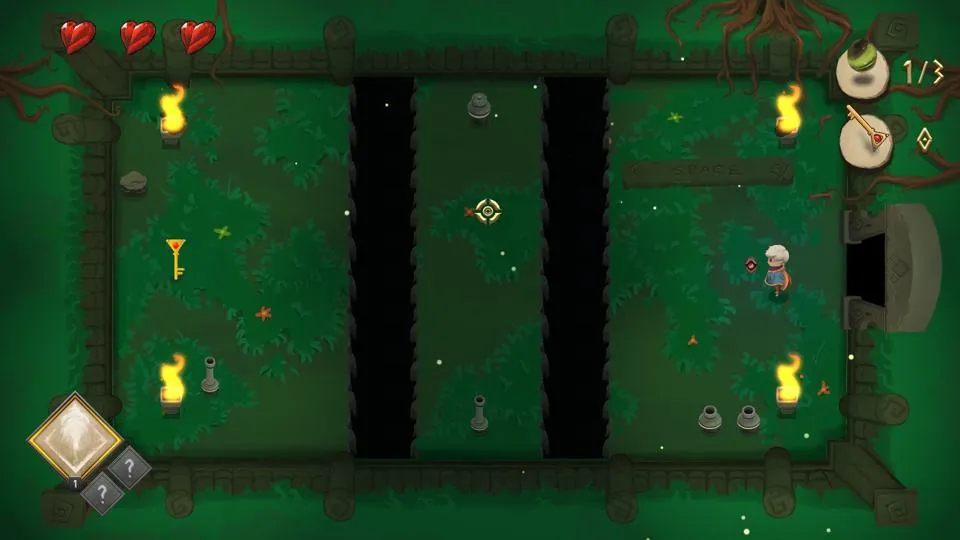 To make her way through the dungeon, Opal has a variety of weapons. Combat is a fairly standard pointing and shooting, combined with a happy little dodge roll that I, more often than not, used to careen myself off a cliff. The mechanics are not unique, nor do they have any need to be.