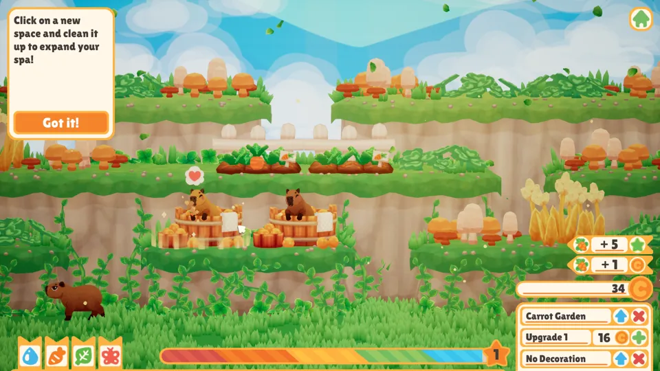 Capybara Spa is a casual simulation game. In it, you turn a large pile of rocks, mushrooms, and nothing into a thriving spa for capybaras, baby capybaras, and whatever other random critters you can abduct and toss into a tub. The capybaras have various desires, such as carrots or little flower hats, and once fulfilled, leave the spa, carrying their new hats, offspring, or parasitic duck friends.