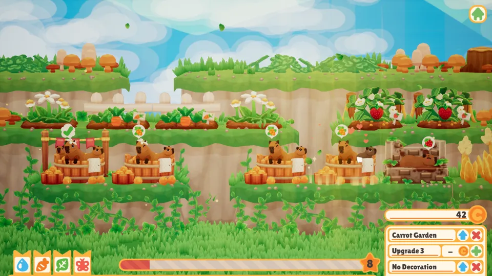 Though Capybara Spa is a game about pampering some capybaras through the liberal application of carrots, it is also ultimately a game about efficiency and automation. I upgraded all my tubs and vegetable gardens quickly, then bought butterflies to feed the capybaras for me (don’t think too hard about it) so I could devote my time to plonking as many capybaras into tubs as I possibly could. In so doing, I reasoned, I could earn as much money as possible to buy more tubs and more automation so I could hunt down more capybaras and grow into a grand capybara spa cum breeding facility empire.