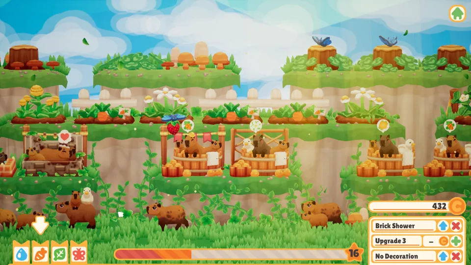 I played Bunhouse a while ago, and in that review, I mentioned that my main critique of the game was my inability to be as much of a greenhouse tycoon as my heart desired. If we really dig into my review of Cat Goes Fishing , we see a similar sentiment, that the lack of ability to be truly mercenary made me dislike the game intensely. Capybara Spa is not Cat Goes Fishing by any means, but I found myself growing increasingly frustrated nonetheless. The limiting factor in my growth was me and my ability to ruthlessly pursue escaping capybaras for my spa. Automation could only take me so far; for me to be truly profitable, I needed a way to automatically boot capybaras from tubs when their time was up, to automatically snag grungy animals and throw them in the tub, to automate every possible step so all I would need to do is sit back and count the fruits of the butterflies my labour.