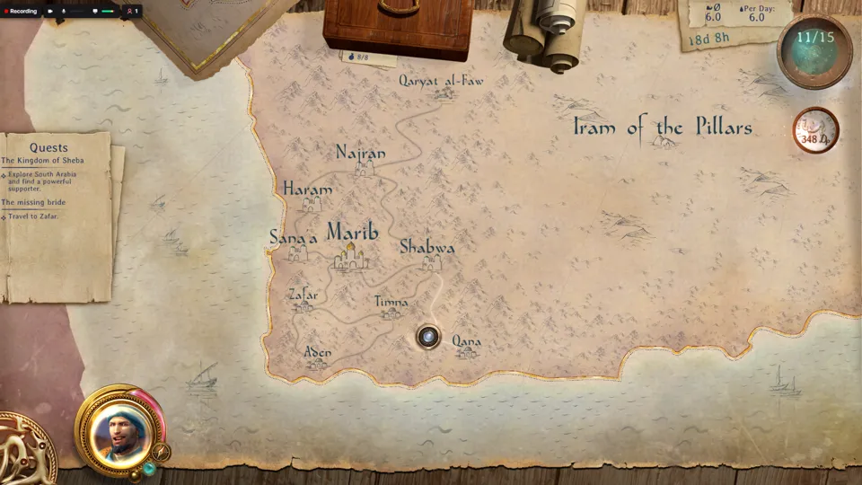 In Caravan, you play as the prince of the Pillars of Iram, a city beset by a djinn’s curse. Your task is to travel around Arabia, trading and gaining support to break the djinn’s curse and retake your throne. Fundamentally, though, it is a caravan game, where you buy and sell commodities for profit, have encounters on the road, and survive your most profitable venture. The game includes a minigame for combat and haggling, but the bulk of it is in choosing a route, choosing goods, and adventuring.