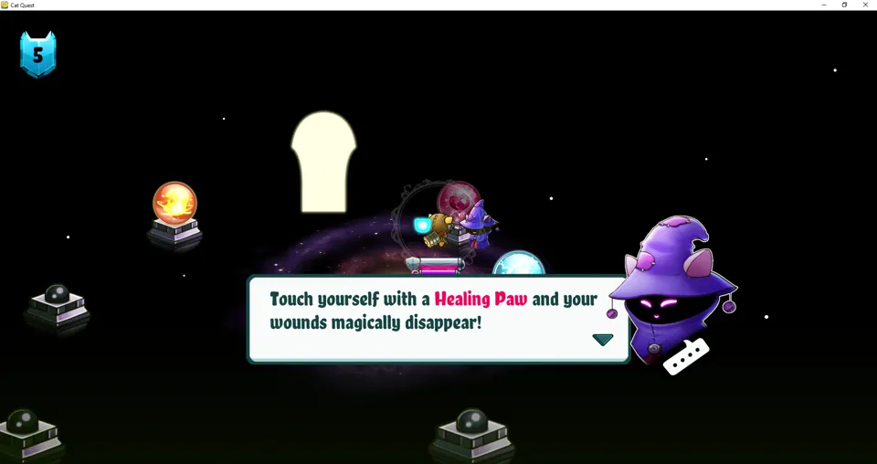 Mechanically, the game lacks many of the complex stat systems that might dissuade a casual player from picking up the genre. The cat has three (potentially four) stats - health, mana, and sword power (and potentially armour) - which are augmented or reduced through different bits of gear. A large variety of gear provides a wide range of ways to build a character. Because there are no skill trees or any permanent changes to the character, this gear also makes it possible to switch playstyles mid-run, or even from fight to fight, depending on the enemy. Making specialisations gear-dependent rather than skills-dependent provides a dynamic, albeit shallower, experience to a playthrough.