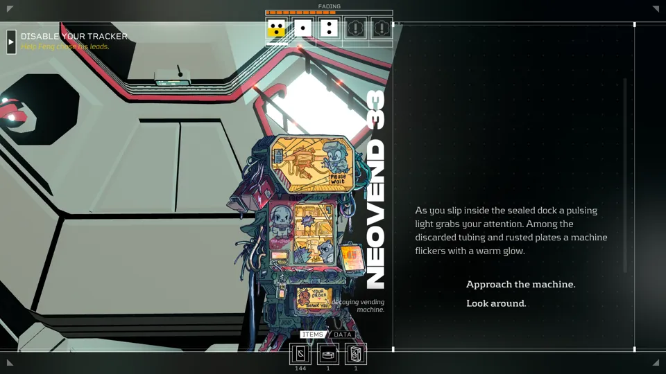 Citizen Sleeper is difficult to place in any particular genre. It has some survival elements, though these are light and fade away by the mid game. It veers close to a visual novel, though it has more interactivity and player agency than I would ascribe to a visual novel. Even though it has some degree of character customisation, it’s not quite an RPG either. It is, much like its main character, a blending of a variety elements into something wholly new and intriguing. The game’s mechanics are similarly unique. The player has a set of dice that they can invest in actions, though how they choose to invest these, and the risks they choose to accept in doing so are wholly up to them. Indeed, the dice themselves are not the point. They are a vehicle to get to the story, and to see how the world around the Sleeper plays out.
