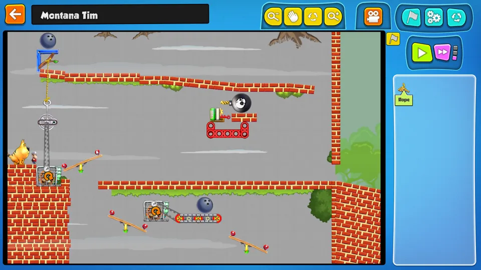 Contraption Maker is a building puzzle game. Players are presented with a goal - such as “Get character A to point B” - and are given a few pieces and the whole of physics with which to solve the puzzle. These pieces do a variety of things, from shooting lasers to starting fires to just providing a platform on which to walk. When supplemented with the pieces already pre-placed in the puzzle, however, these simple pieces still offer a range of possibilities for solving whatever puzzle the player faces.