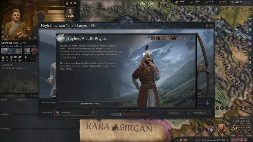 As with any story generator, the game’s ability to remain immersive and compelling is largely dependent on what the player themselves is putting into the game and what they intend to accomplish within it. While the strategic elements and the building towards some goal help provide some sort of impetus, the strategy alone isn’t enough to overcome the sometimes repetitive random events and tedium of being an impoverished lord. Seeing how those repetitive events play out within a particular situation or lifetime, however, gives a little more meaning, especially when viewed as roleplaying moments. My khan’s quest to woo his wife, for example, may greatly resemble his father’s attempts to court his wife, but because it is a new khan with a new perspective, the events somehow manage to stay fresh and new.