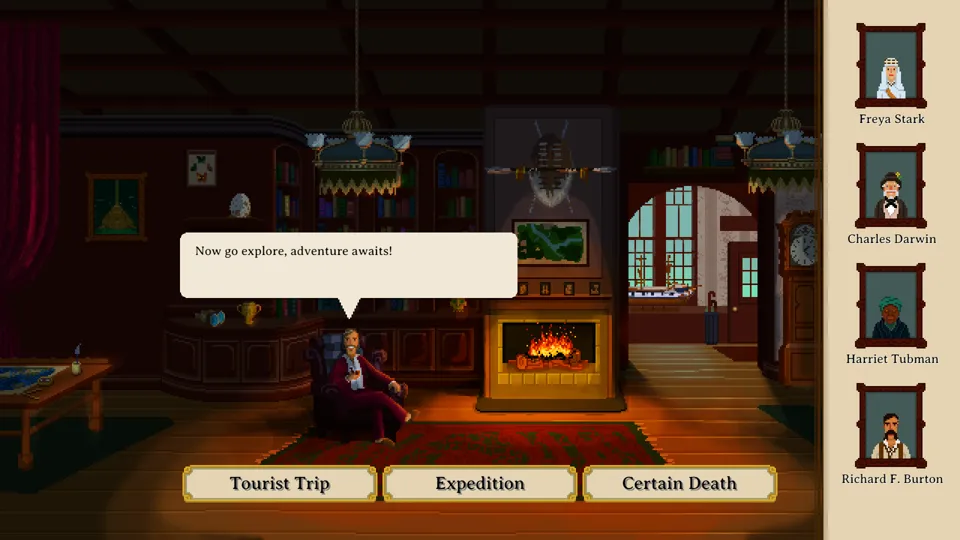 Curious Expedition’s colonialist narrative is told through the lens of a series of expeditions into parts unknown. The player plays as an explorer (my personal favourite option is Rasputin), and travels to far-off lands in search of treasure, stories, and adventure. This treasure is then brought back to London where it is either donated to a museum to much fame and acclaim, or sold to fund the next expedition. While these expeditions are discrete stories, each builds on the next through the party members obtained, the funds gained, and the general lessons learned.