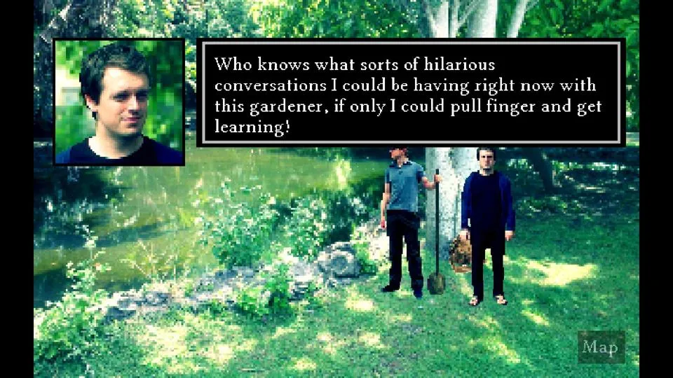 A Date in the Park is a point and click adventure game. You play as Lou, a British immigrant to Portugal who is meeting a girl for a date in the park. As Lou searches for his date in the park, he finds a series of mysteries she’s left for him, leading him to get more and more excited for their actual date and for the point when he gets to see her.