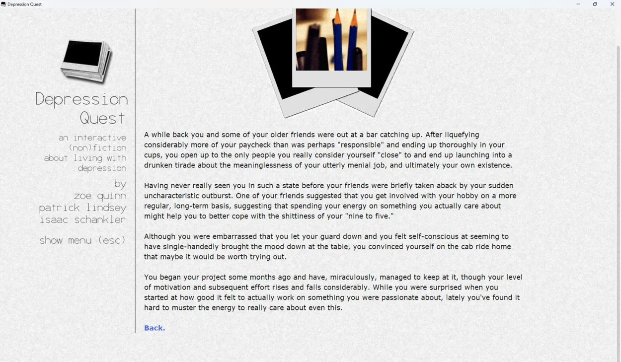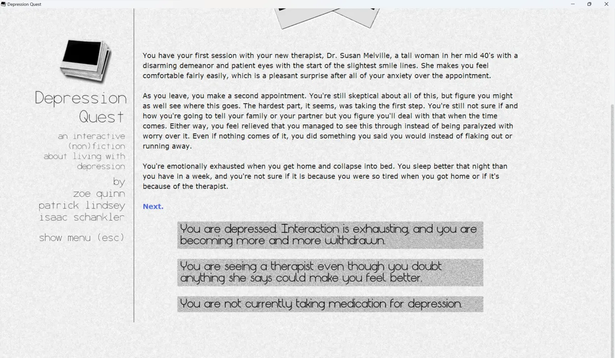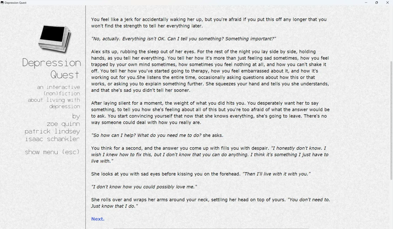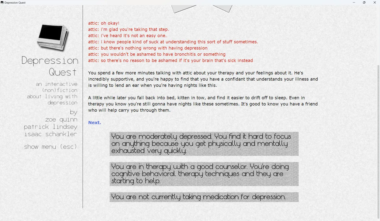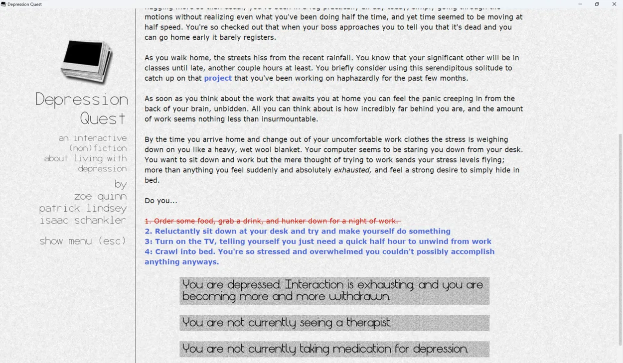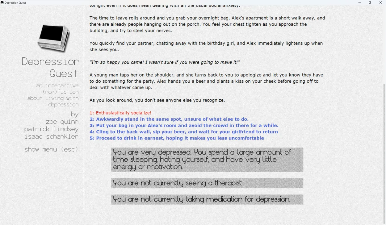 Depression Quest is a narrative game following the story of an unnamed protagonist as they move through life with depression. The game presents its narrative through snapshots of the protagonist’s life, presenting the player with choices of how to respond to those situations, and changing the story depending on the choices they make. Throughout, the game provides updates on how depressed the protagonist is and how their life is going as the protagonist either improves or spirals deeper and deeper into depression.