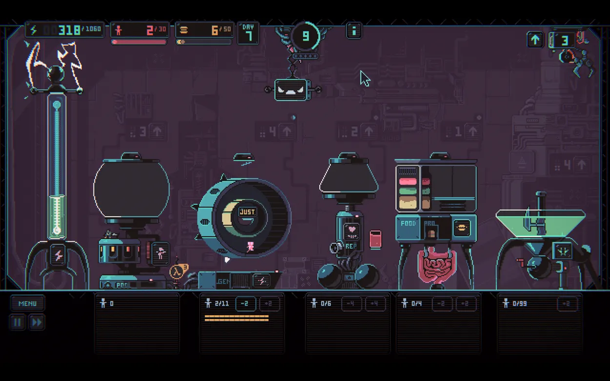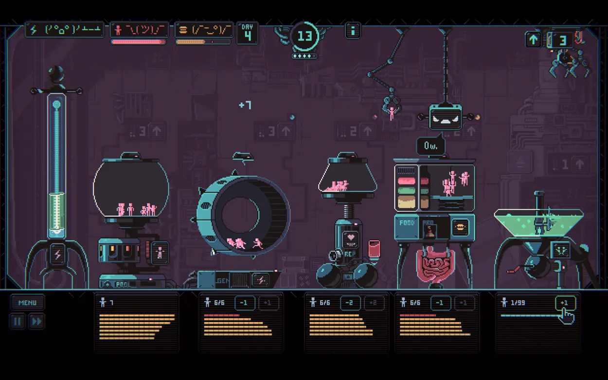 As I played through the game, I noticed that, to succeed, I had to stop thinking about the humans in my machine as entities, and instead, a pool of resources. I paid less attention to the visuals of tiny pixel humans running on a wheel or bonking in a tube, and more to the gauges and metres at the top of my screen. I looked down only inasmuch as was required to click the button to add more resources to a pool, or to remove the ones that were on the verge of dying of exhaustion. More often than not, I hovered my cursor over the disposal button, transforming headcount into power and food as fast as I could produce it. This wasn’t a game where I benefited from thinking about what I was doing in any kind of human sense, but rather, where I won by thinking about the problem as mechanically and disconnectedly as possible. I had a large number of humans. I wanted to produce a reasonable amount of labour and dispose of the rest. What I needed was the most…