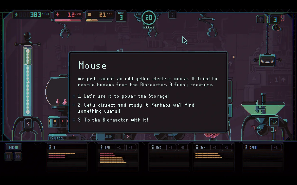 This is a game that is very easy to learn, and very difficult to master. My original plan of comparing it to As Far As The Eye is still a valid one as, like that game, it is deceptively difficult, and that difficulty is part of the appeal. Everything in the engine seems designed to lead the player to failure. As the requirements to continue steadily creep higher and higher, and the number of things to do grows and grows, the game becomes not only a challenge of planning and scaling, but of clicking fast enough and paying attention to a wide range of rapidly changing circumstances. As of this review, I’ve only made it to day 12 of 21, but even there, one small mistake is all it takes to lose all progress. It is unrelentingly difficult, but in a delightful and addictive sort of way. It’s difficult while still feeling possible, which is a difficult but fantastic balance to strike.