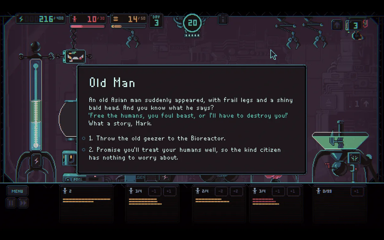 Despotism 3k is, on its surface, a game with black humour and jokes and references scattered throughout, providing an engineering and efficiency challenge in an increasingly unstable environment. Its humour is good and keeps the game engaging, even as the difficulty ramps up and up and up.